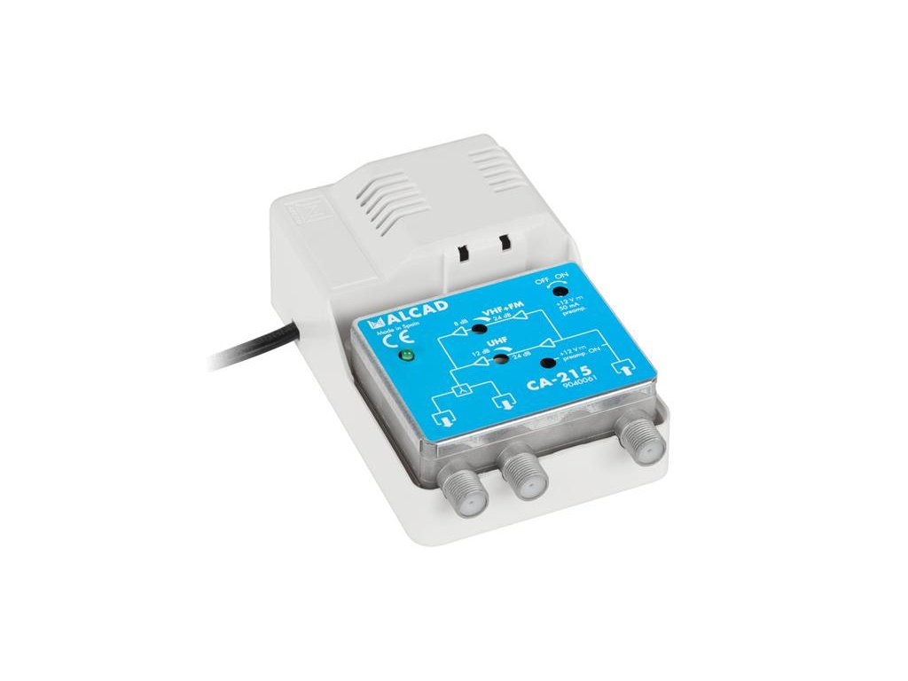 Anténny zosilňovač ALCAD CA-215, VHF+UHF, malý domovej aj do interiéruZosilňovač CA-215 je malý domový zosilňovač pre pozemný analógový a digitálny príjem TV/FM signálov. ZAMAC odliatku ktorý má vynikajúce tieniace účinky a je krytý plastovým obalom Zosilňovač má možnosť zapnúť na vstupe napájanie predzosilňovača +12V s automatickým odpojením v prípade skratu.