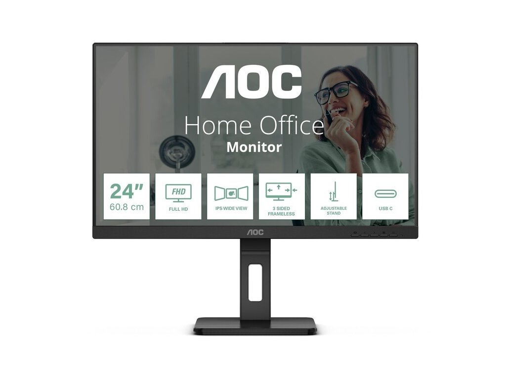 AOC 24P3CV, LED Monitor 24" kancelársky, Full HD 1920 × 1080, obnovovacia frekvencia 75Hz, odozva 4ms, jas 300 nitov, HDMI 1.4, DisplayPort 1.2, USB-C (PD 65W). Uhlopriečka 23,8"/60 cm, výškovo nastaviteľný stojan , formát obrazovky: 16:9, IPS panel, antireflexný, kontrastný pomer 1000:1, slúchadlový jack, VESA 100 x 100.Dodatočné parametre