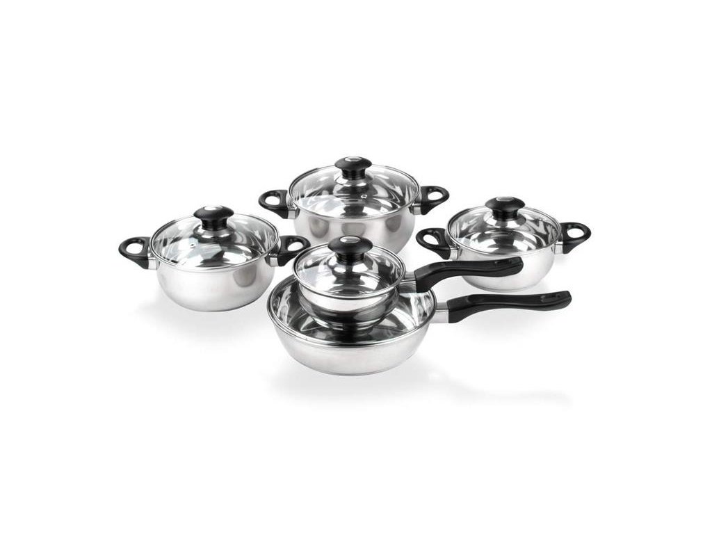 10dílná sada nerezového riadu Glory, sada obsahuje: hrniec s pokrievkou 16 x 7,5 cm, hrniec s pokrievkou 18 x 8,5 cm, hrniec s pokrievkou 20 x 9,5 cm, panvica s pokrievkou 22 x 6 cm, rajnica s pokrievkou 14 x 6,5 cm, materiál - nerez 201, sklenené poklice.Hrnce možno používať na všetky typy varných dosiek, vrátane indukcie.