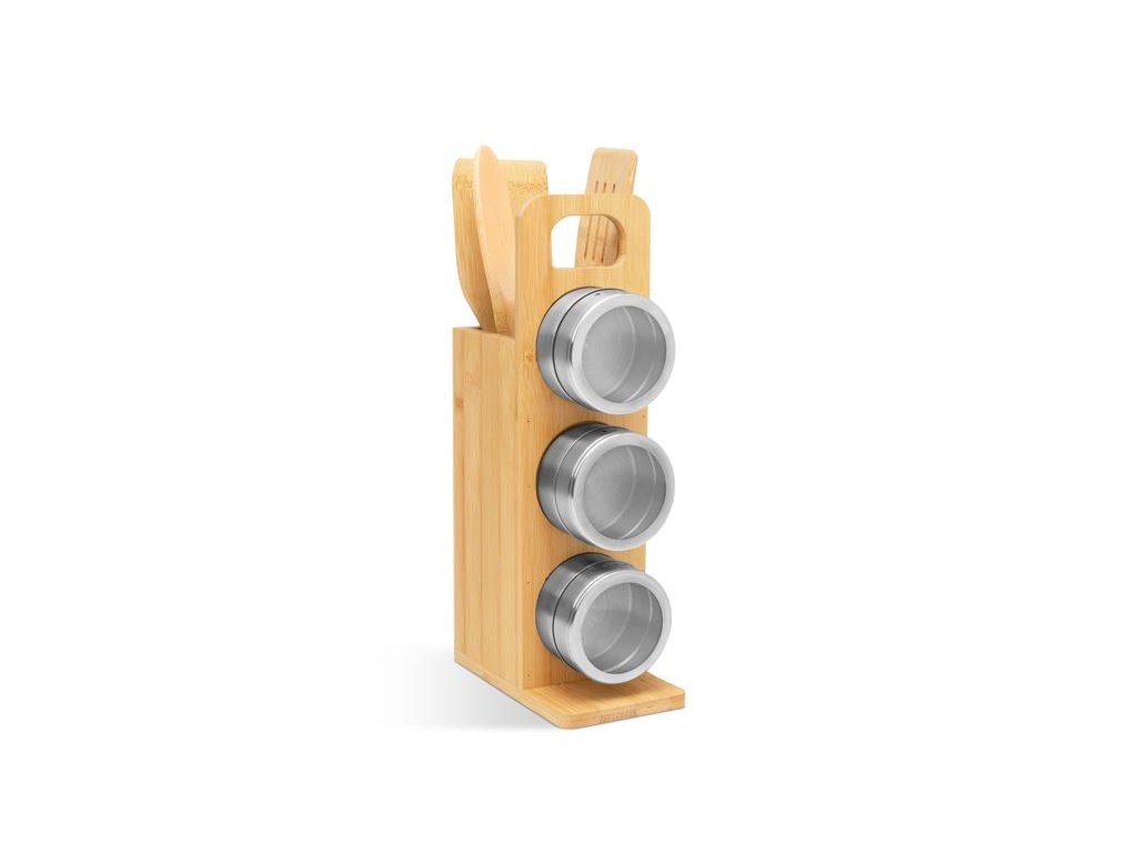 Držiak na korenie a kuchynské pomôcky vyrobený z prírodného bambusového materiálu.Vďaka magnetu na prednej časti držiaka môžete uložiť 3 ks držiakov na korenie s priehľadným vekom.Vrchné časti držiakov je možné odstrániť alebo skrútiť, takže máte ľahký prístup a potrebné množstvo korenia môžete pridať cez otvory na boku.Lopatka, stierka a varecha vyrobené z bambusového materiálu sú potrebným doplnkom v každej kuchyni.
