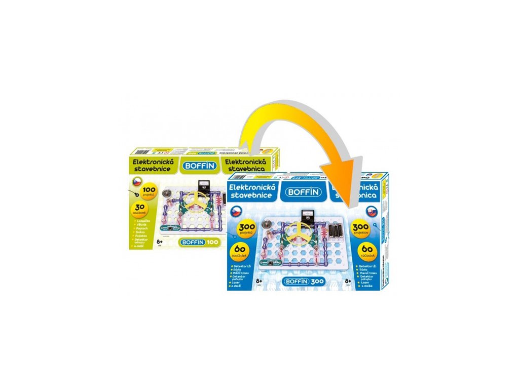 Stavebnice elektronická BOFFIN I 100 - rozšíření na BOFFIN I 300 Rozširujúci set pomocou ktorého si rozšírite stavebnicu Boffin 100 o ďalšie súčiastky a 200 nových projektov a budete mať plnohodnotnú stavebnicu Boffin 300. Základom všetkých projektov je doska, na ktorú sa jednotlivé súčiastky jednoducho nacvakávají. V manuáli je popísané, čo by projekt mal robiť a čo od neho očakávať. Po zostavení si môžete skontrolovať, či všetko funguje. Jednotlivé súčiastky a projekty môžete kombinovať so súčiastkami a projekty v ostatných stavebniciach Boffin a vymyslieť stovky ďalších projektov, ktoré nie sú popísané v manuáli. Môžete si postaviť projekty: - Rádio - Detektor lži - Vodné poplach - Merač tlaku - Detektor pohybu - Merač odporu - Zvukovú vlnu - Laser