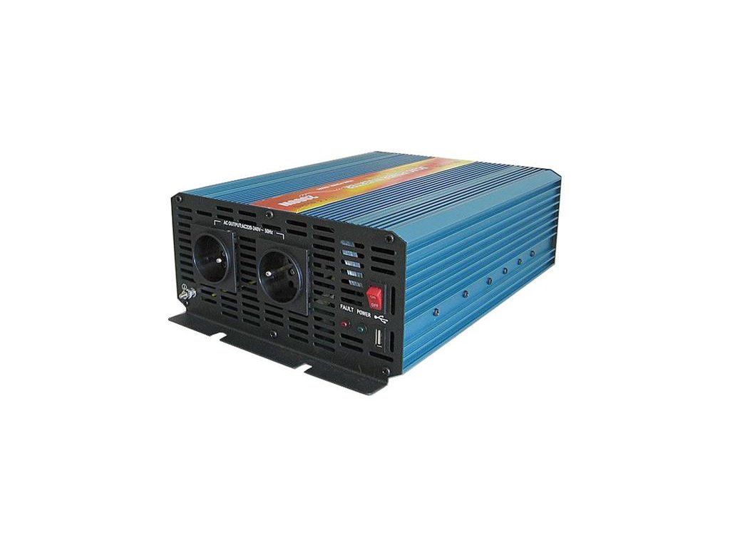 Menič napätia 12V/230V 2000W CZ čistá sinusovka,CARSPA, dálkové ovládáníMenič napätia 12V / 230V + USB 2000W, CARSPA P2000, čistá sínusoida + diaľkové ovládanie. Menič je vhodný pre spotrebnú elektroniku, náradie aj iné spotrebiče s nárokmi na čistý sínusový priebeh výstupného napätia. Súčasťou je diaľkové ovládanie s káblom 5m a indikáciou zapnutia a chybových stavov.