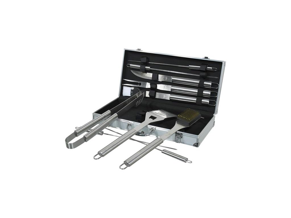 V sade sa nachádza obracačka s precízne zabrúsenou hranou vybavená zúbkovaným ostrím, otváračom zátok a otvormi na odtok. Kliešte, špeciálne tvarované pre istý úchop najrôznejších pokrmov, kefu na údržbu grilu, kedy samotná kefová časť je z mosadze. Nepostrádateľnou časťou grilovacieho náradia je aj dvojzubá vidlička, štetec so štetinami z nylonu, na potieranie, či mašlovanie pokrmov, porciovací nôž a 4× grilovacie ihlice s hrotmi brúsenými do špičky.