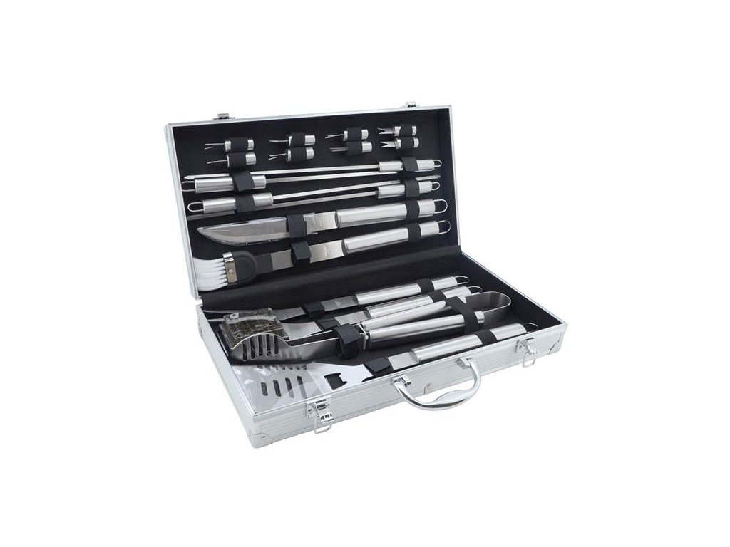Obracačka dĺžky 44 cm, s precízne brúsenou hranou, vybavená vlnitým ostrím, otváračom zátok a otvory pre odtok. Kliešte, špeciálne tvarované pre istý úchop najrôznejších pokrmov, dĺžky 43 cm. Kefa dĺžky 42 cm pre údržbu grilu, kedy samotná kefová časť z mosadze má rozmery 7 x 5,5 cm. Nepostrádateľnou časťou grilovacieho náradia je aj dvojzubý vidlička dĺžky 43,5 cm. Štetec dĺžky 44 cm sa 4,5 cm štetinami z nylonu, pre potieranie, či mašlování pokrmov. Porciovanie nôž dĺžky 42 cm, kde ostrie je dĺžky 16 cm. 4x grilovacie ihlice celkovej dĺžky 42 cm, kde na pokrmy možno využiť celých 30 cm, hroty ihlíc sú brúsené do špičky. Poslednou súčasťou náradie je 8x Napichovátka dĺžky 7 cm, určené pre držanie kukurice.