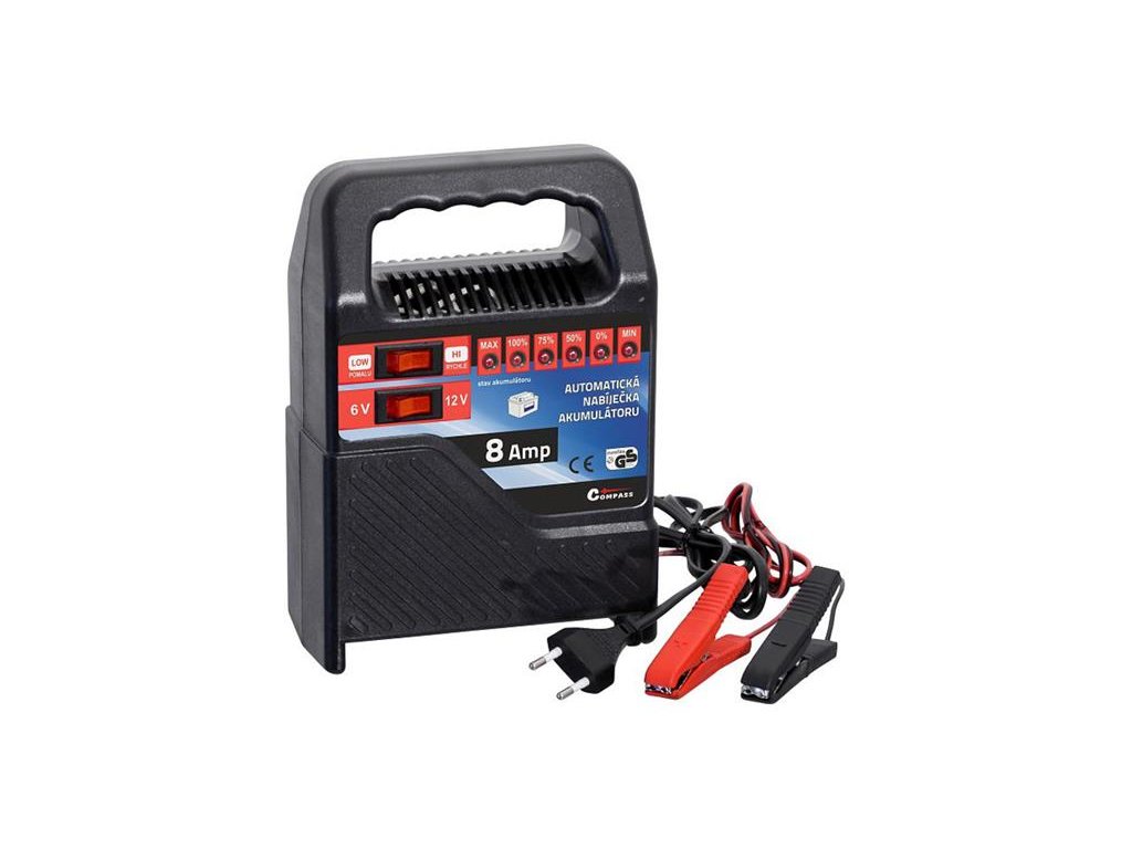 Nabíjačka akumulátorov COMPASS 07138 6/12V 8APřenosná automatická nabíječka akumulátoru 6/12V 8A, napájení 220V. Pro akumulátory 6/12V 15-80Ah, max. nabíjecí proud 8A. Baleno v barevné krabici. Homologace GS/TUV