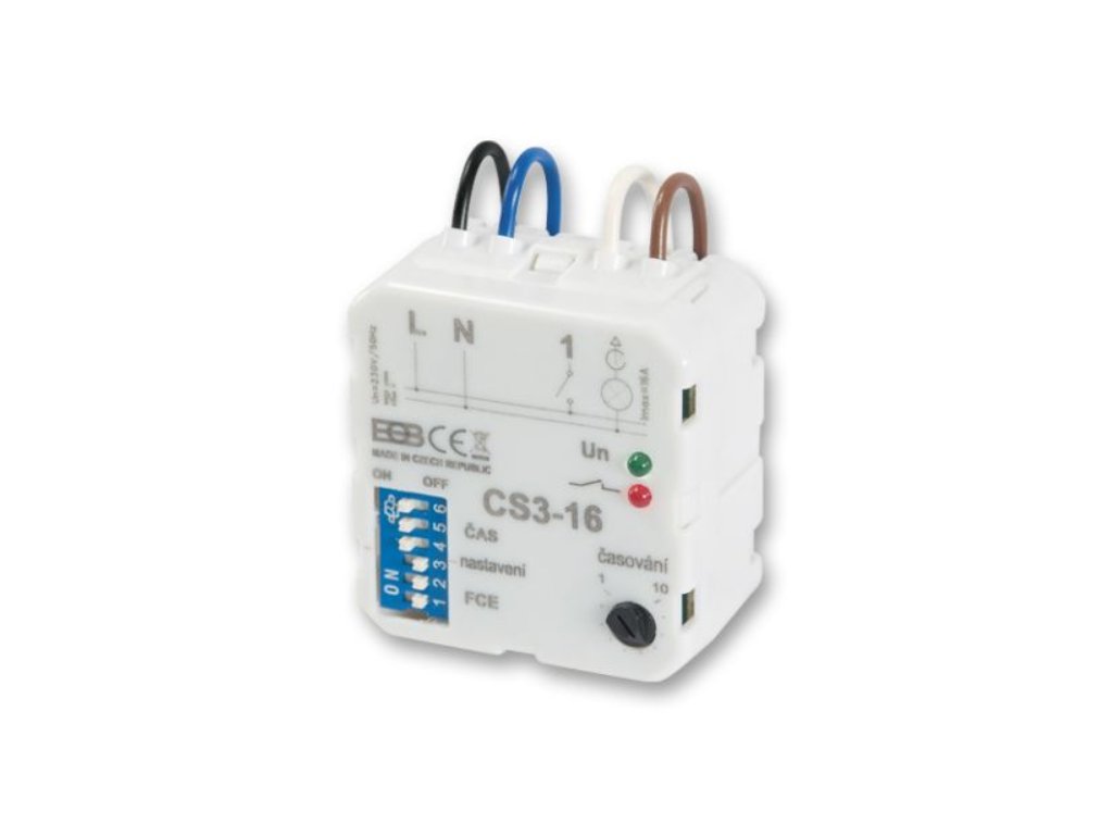 Časový spínač ELEKTROBOCK CS3-16 multifunkčníSpínač pod vypínač CS3-16 pro větší zátěže má možnost nastavení OSMI FUNKCÍ SEPNUTÍ.