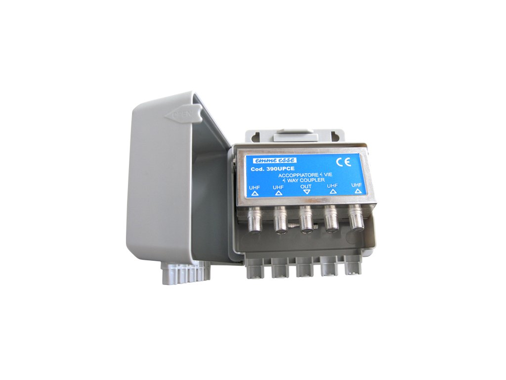 Anténny zlučovač Emme Esse 83199CE, na stožiar, vstup 4xUHF pre ant. štvorkeZlučovač pre malé TV rozvody, ktorý dokáže zlúčiť signál až zo štyroch televíznych antén v pásme UHF. Je výhodný pre zlúčenie štyroch rovnakých antén v pásme UHF pre zosilnenie slabého signálu. Každé zdvojnásobenie počtu antén znamená teoreticky zvýšenie úrovne signálu o 3dB, prakticky sa musí vziať do úvahy priechodná útlm zlučovače a nehomogenita elektromagnetického poľa. Antistatická plastová škatuľka je odolná proti poveternostným vplyvom a montuje sa na anténny stožiar max.priemerom cca 55mm pomocou FeZn strmeňa so závitom M4 a krídlovými matičkami. Zlučovač je umiestnený v odliatku. Vstupy a výstupy zlučovače sú vykonané konektormi typu F.