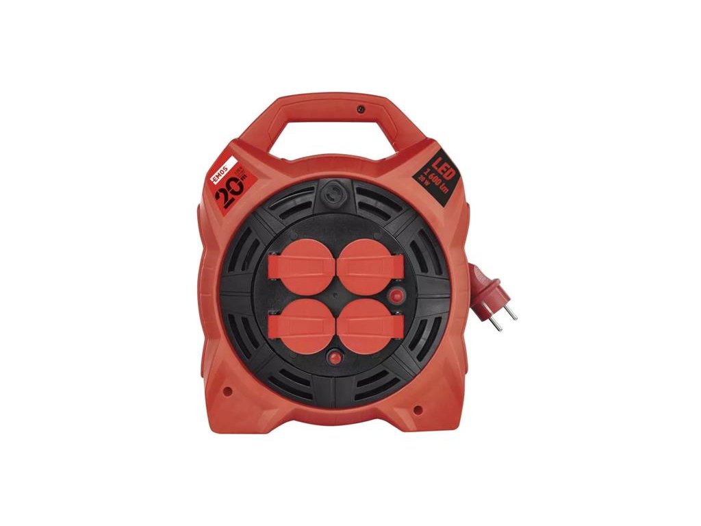 Vonkajší predlžovací kábel na bubne 20 m/4 zás./guma/230 V/1,5 mm2 s LED reflektorom. Max. zaťaženie plne rozvinutého kábla je 3 000 W (13 A). Vodič H05RR je určený pre stredné mechanické namáhanie v prostredí obyčajnom, studenom aj horúcom, vlhkom aj mokrom. Krytie IP44 umožňuje použitie vo vonkajšom prostredí, súčasťou tela navijakov je aj LED reflektor ktorý ocenia nielen stavební robotníci na stavbách tak aj bežní používatelia. Svetelný tok 1 600 lm, čo zhruba zodpovedá 130 W žiarovke zaručí dostatočný svetelný výkon.