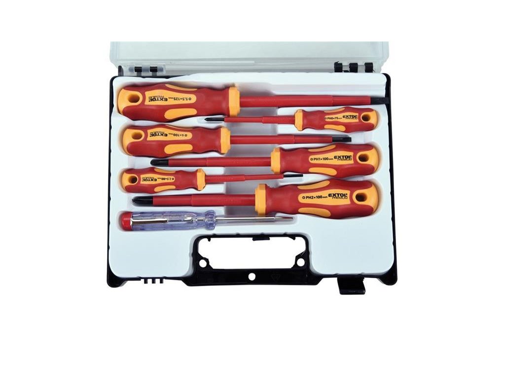 Sada skrutkovačov EXTOL PREMIUM 53087 7ksŠroubováky elektrikářské s testičkou, sada 7 ks náradie s rukoväťou z TPR pryže v kombinácii s plastom, CrV kov v matnej úpravě.
