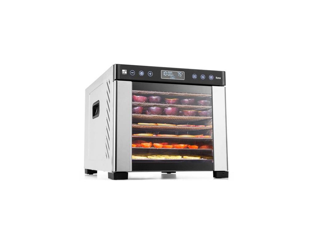 Zatiaľ čo u iných sušičiek v tejto cenovej kategórii je ventilátor umiestnený na spodnej časti, takže plata so sušenými surovinami musíte pre lepšie usušenie presúvať, Kona je svojím prevedením o triedu vyššie. Vďaka strategicky umiestnenému ventilátoru v nej prúdi vzduch horizontálne. Dvierka s okienkom na čelnej strane navyše zaisťujú nižšiu spotrebu energie, dokonalú cirkuláciu vzduchu, efektívnejšie sušenie a skracujú dobu sušenia potravín.
