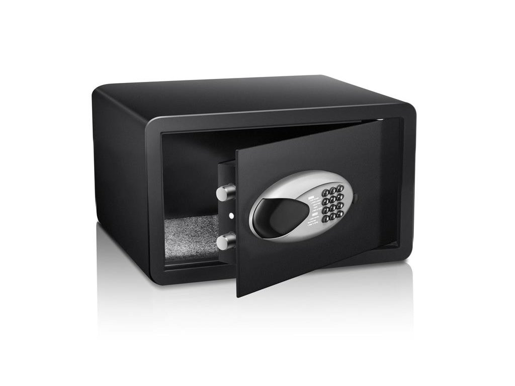 Hotelový trezor G21 s úložným priestorom 30 litrov je dostatočne priestranný pre bezpečné uloženie šperkov, bankoviek, osobných dokladov, kľúčov aj ďalších menších cenností, ktoré bežne hostia nechávajú na hotelovej izbe. Trezor je vyrobený z kvalitného pevného materiálu. Steny trezoru sú z oceľového plechu o sile 2 mm, ktorý odolá pokusom o násilné vniknutie. V prípade dvierok je oceľový plech z bezpečnostných dôvodov zosilnený na hrúbku 4,5 mm. Aby trezor nikto neodniesol, je opatrený otvormi pre upevnenie do steny alebo k podlahe. Skrutky pre ukotvenie sú súčasťou balenia. Pre bezpečné uzavretie je trezor opatrený digitálnym zámkom s číselnou kombináciou a informačným LED displejom. S pomocou priloženého návodu si ľahko nastavíte vlastný 6miestny kód. Na digitálnom zámku trezora dá tiež nastaviť dátum a čas. Na displeji je možné potom v prípade potreby skontrolovať až 105 záznamov o otvorení trezoru. Pre núdzové otvorenie trezoru sú okrem digitálneho zámku dvierka vybavená tiež mechanickým zámkom na kľúč. V balení nájdete 2 kľúče pre prípad, že by ste jeden z kľúčov stratili, alebo chceli umožniť prístup do trezoru inému.