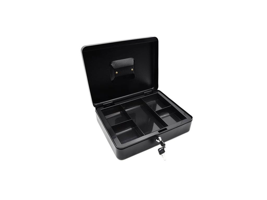 Praktická kovová schránka na peniaze uzamykateľná kľúčom je vybavená nosnou rukoväťou a vnútorným plastovým zakladačom na mince.