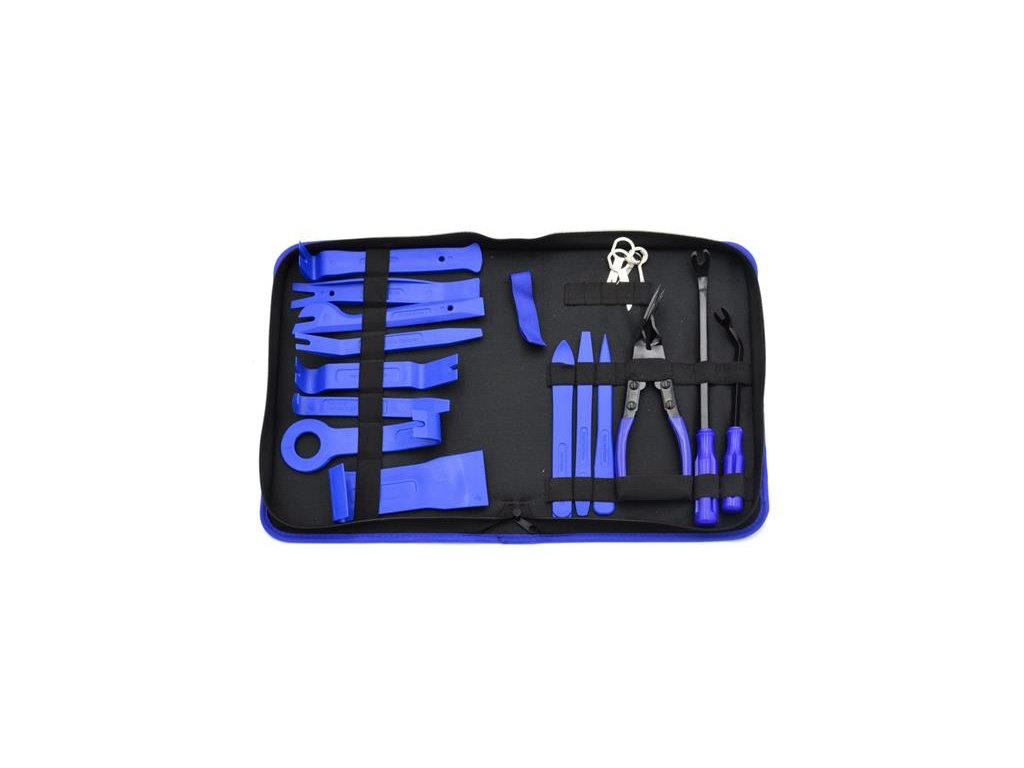 Náradie a prípravky na demontáž (odstránenie) a montáž autorádií a príchytiek čalúnenia/tapecíra, sada 20 kusov v puzdre. Multifunkčná súprava na prácu v interiéri vozidla. Obsahuje rôzne plastové nástroje (kliny, páky a háky), špeciálne kliešte a páky na čalúnické príchytky a nástroje na rádiá. Dodávané v púzdre na zips pre ľahké skladovanie a prepravu.