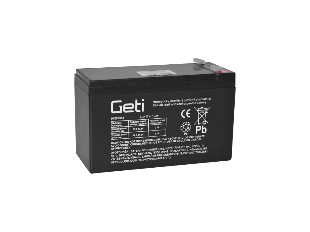 Batérie olovená 12V 7.0Ah Geti (konektor 4,75 mm)Olovený akumulátor Geti typu AGM je vhodný ako náhrada za batérie pre záložné systémy UPS, záložné zdroje pre všetky aplikácie EZS, EPS a telekomunikácie, záložné svietidlá a nabíjacie baterky, hračky, riadiace systémy, alarmy, výstražné mobilné a signalizačné zariadenia a pod. Jedná sa o bezúdržbový, hermeticky uzavretý akumulátor, čo umožňuje ľubovoľnú pracovnú polohu. Náhrada za batérie RBC48 pre záložné zdroje SUA750, SUA750I, SUA750US.