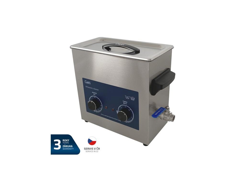 Ultrazvuková čistička Geti GUC 06A s objemom nádoby 6 l a funkcií nastavenia ohrevu intenzívne a najmä dokonale vyčistí predmety z kovu, plastu, skla, porcelánu i keramiky.Na tento výrobok poskytujeme 3 roky záruku. Ultrazvuková čistička Geti GUC 06A s ohrevom vyčistí všetko od povrchových nečistôt a to len pomocou vody a vibrácií, ktoré vytvára ultrazvuk. Ultrazvukové čistenie je založené na kavitačním efekte spôsobenom vysokofrekvenčným vibračným signálom ultrazvukových vĺn v tekutine. Vytvára sa mikroskopické bubliny, ktoré prudko implodujú a spôsobujú kavitácii, ktorá spôsobuje intenzívne čistenie na povrchu čisteného predmetu. Bubliny sú dostatočne malé, aby prenikli mikroskopickými štrbinami a tým dôkladne a dôsledne čistili predmet. Používa sa na čistenie širokej škály nástrojov a mechanických súčastí.