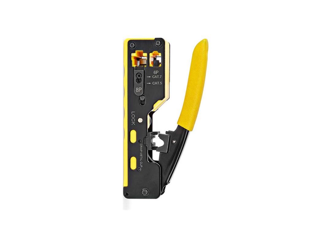 Krimpovací nástroj pre priechodné konektory RJ45, RJ12, vhodná pomôcka, ktorá sa bude hodiť v dielni každého majstra. Tento kompaktný a odolný nástroj bol navrhnutý tak, aby inštalácia bola rýchla a jednoduchá. Pohodlné uchopenie a jednoduché upnutie vyžadujú iba minimálnu silu ruky. Zámok v tvare pištole udržuje nástroj bezpečne zatvorený, keď sa nepoužíva