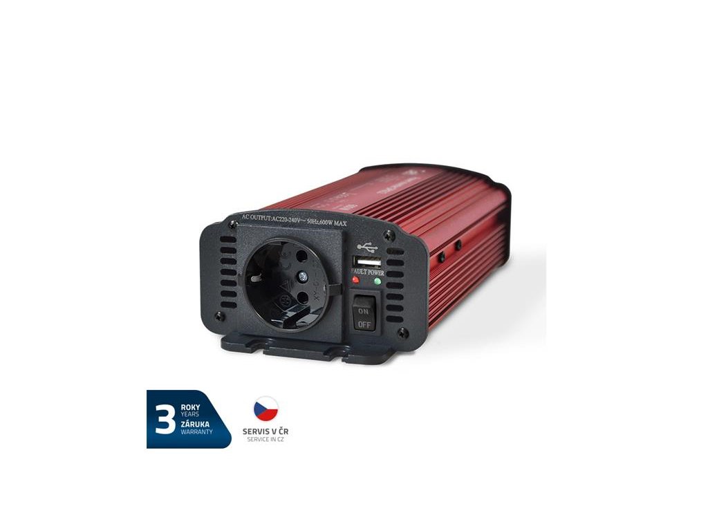 Invertor - Menič vytvára z jednosmerného napätia 12V striedavé napätie 230V . To umožňuje pripojenie najrôznejších spotrebičov 230 V k zdroju napätia ako napr. v aute, na člne, pri solárnych zariadeniach na chatách alebo pri kempovaní. Ideálne pre pripojenie digitálnej kamery, mobilného telefónu, notebooku, tlačiarne, lampy, CD/DVD prehrávača, rádia atď s maximálnym príkonom do 600W. Menič je tiež vybavený USB výstupom pre napájanie rôznych zariadení cez rozhranie typu USB 2.0. Prístroj obsahuje ochranu proti opačnej polarite, nízkemu/vysokému napätiu, skratu, preťaženiu, prehriatiu a vysokému/nízkemu napätiu batérie. Zvlnenie výstupného napätia má tvar modifikovanej sínusoidy.