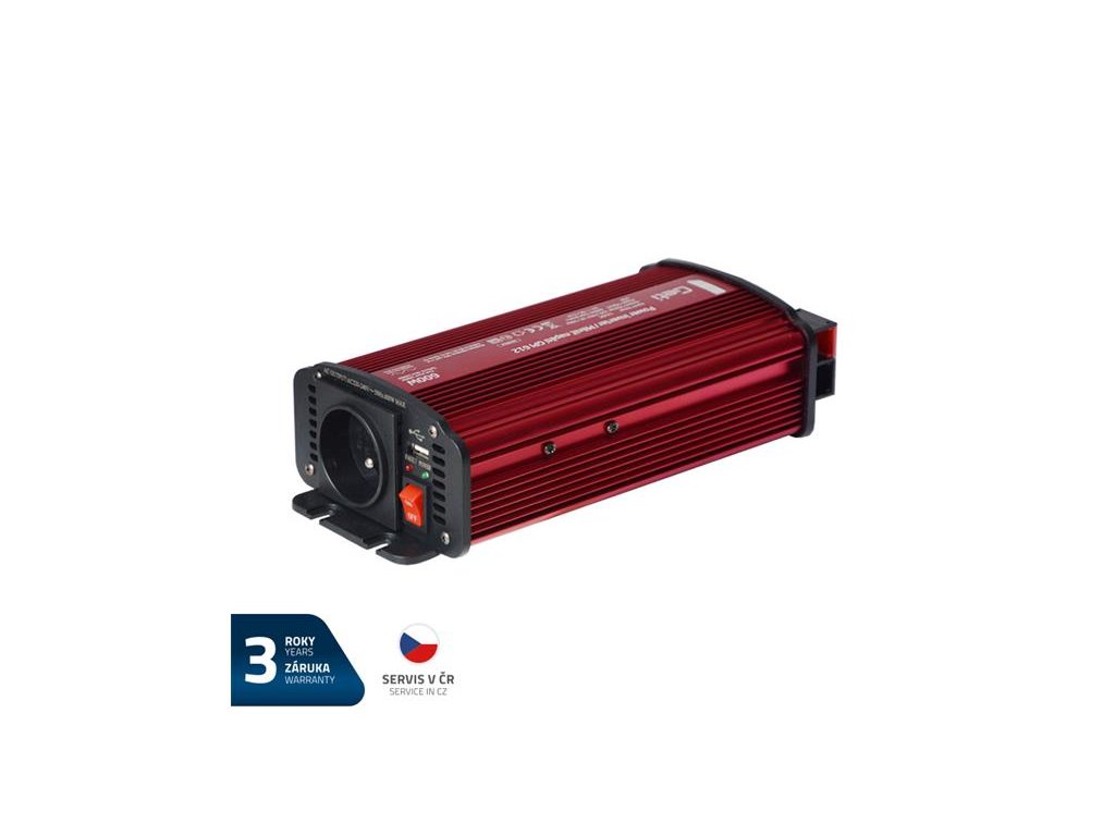 Invertor - Menič vytvára z jednosmerného napätia 12V striedavé napätie 230V. To umožňuje pripojenie najrôznejších spotrebičov 230 V k zdroju napätia ako napr. v aute, na člne, u solárnych zariadení na chatách alebo pri kempovaní. Ideálny pre pripojenie digitálnej kamery, mobilného telefónu, notebooku, tlačiarne, lampy, CD / DVD prehrávača, rádia atď s maximálnym príkonom do 600W. Menič je rovnako vybavený USB výstupom pre napájanie rôznych zariadení cez rozhranie typu USB 2.0. Prístroj obsahuje ochranu proti opačnej polarite, nízkemu / vysokému napätiu, skratu, preťaženiu, prehriatiu a vysokému / nízkemu napätia batérie. Zvlnenie výstupného napätia má tvar modifikovanej sínusoidy.
