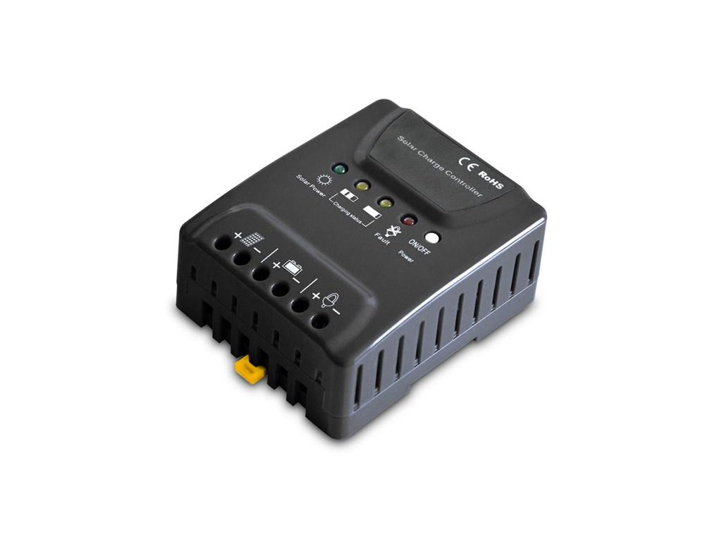 Solárny regulátor PWM Geti GSR020Solárny regulátor PWM Geti GSR020 s indikáciou nabíjania, odberu prúdu a napätia batérie. Určený pre systémové napätie 12V alebo 24V s pevne nastavenými prevádzkovými parametrami a maximálnym nabíjacím aj záťažovým prúdom 20A pre panely do 240W-12V alebo 480W-24V.