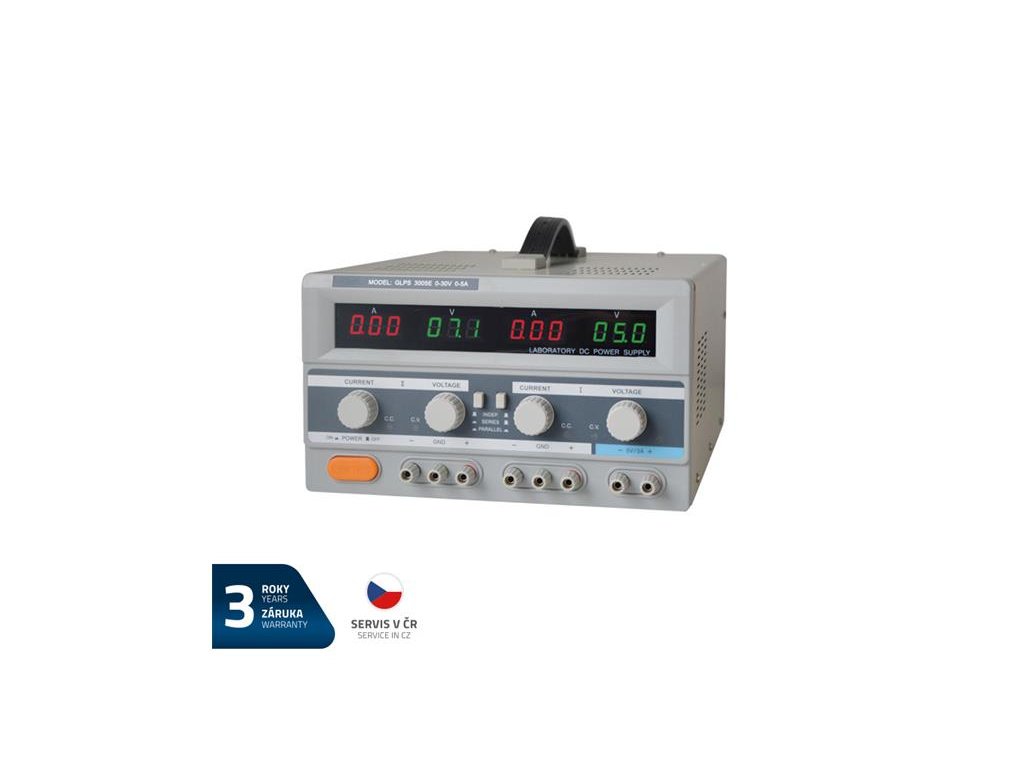 Zdroj laboratórny Geti GLPS 3005E 2x0-30V/ 0-5A+ (5V-3A)Na tento výrobok poskytujeme 3 roky záruku.