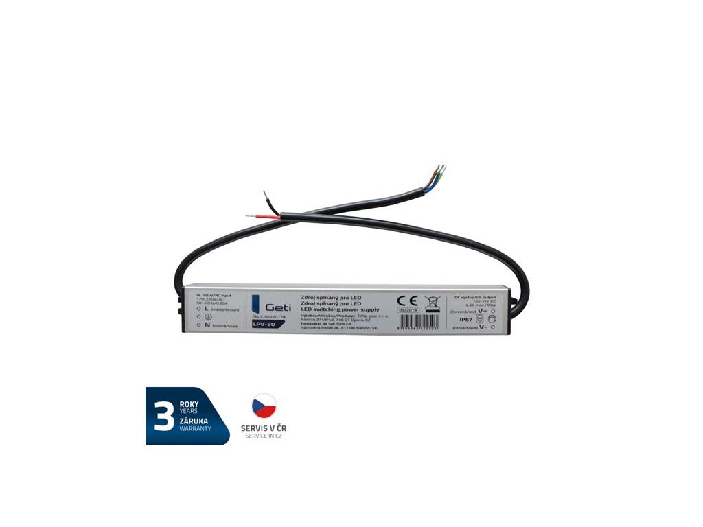 Zdroj spínaný pre LED 12V/ 50W Geti LPV-50Na tento výrobok poskytujeme 3 roky záruku. Spínaný zdroj konštantného napätia LPV-50, s výstupným napätím 12V je vhodný pre napájanie LED pásikov. Vysoký stupeň krytia IP67 zaisťuje ochranu proti prachu a vode.