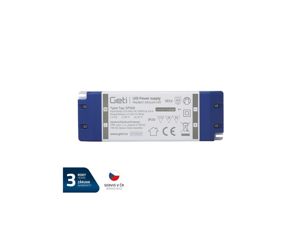 Na tento výrobok poskytujeme 3 roky záruku. Spínaný zdroj konštantného napätia GETI GPS60, s výstupným napätím 12V, ktorý je vhodný pre napájanie LED pásikov.