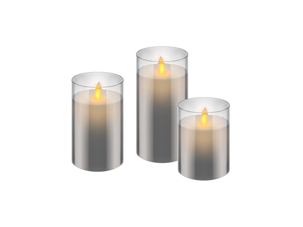 - sada 3 bielych LED sviečok v šedom skle v rôznych veľkostiach (7,5 x 10 / 12,5 / 15 cm)