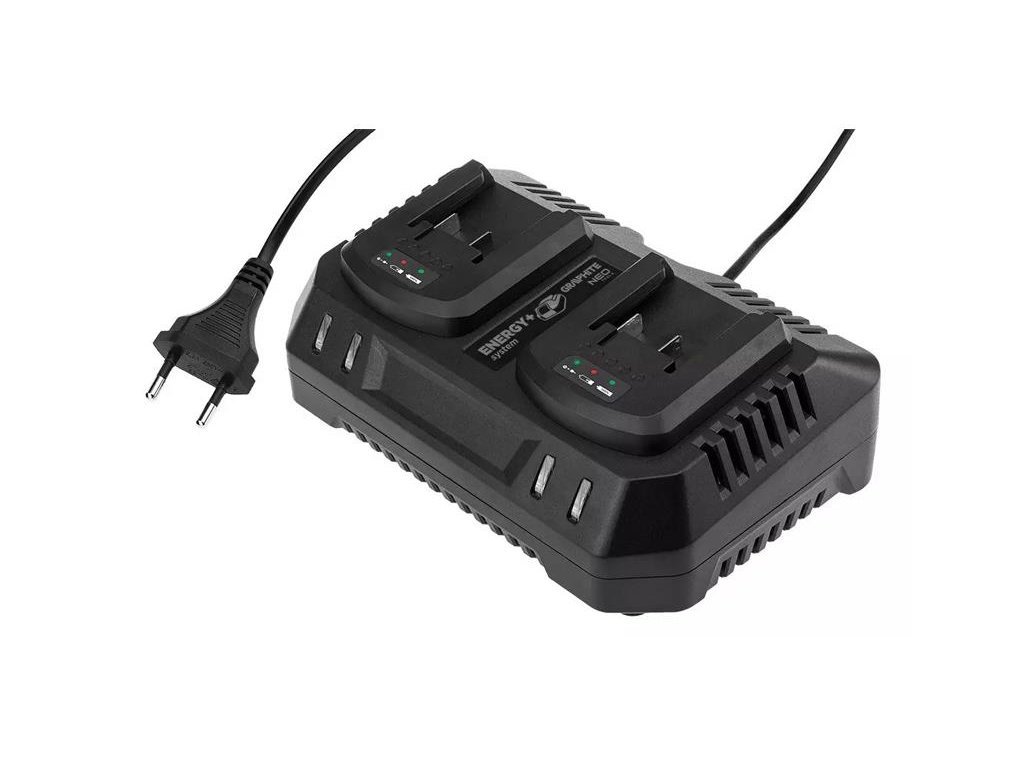 Praktická duálna nabíjačka z radu GRAPHITE Energy+ pre profesionálov i domácich majstrov, ktorá umožňuje súčasné nabíjanie až dvoch batérií. Zariadenie je určené na nabíjanie lítium-iónových batérií s napätím až 18 V. Maximálny pretekajúci prúd je 3000 mA. Nabíjačka je vybavená systémom regulácie napätia a teploty, vďaka ktorému zaisťuje zodpovedajúcu bezpečnosť počas používania tým, že zabraňuje prehrievaniu tela.