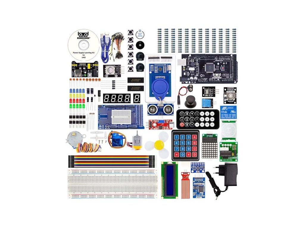 Výukový kit sa 39 projekty s podrobnými tutoriály na CD KIT obsahuje: - 25ks LED (biela, žltá, modrá, červená, zelená) - 1ks LED RGB - 10ks keramický kondenzátor - 2ks fotoodpor - 1ks termistor - 5ks diod 1N4007 - 4ks elektrolytický kondenzátor (10uF/50V a 100uF/50V) - 10ks NPN tranzistor (PN2222 a S8050) - 1ks přepínač sklonu - 5ks tlačidlo malé - 1ks 1 miestny 7-segmentový displej - 1ks 4 miestny 7-segmentový displej - 1ks zvukový senzor - 1ks displej LCD1602 - 1ks IC L293D - 1ks IC 74HC595 - 1ks aktivný bzučiak - 1ks pasívny bzučiak - 1ks RTC modul - 1ks DHT11 modul teploty a vlhkosti - 2ks potenciometr - 1ks rotary Encoder Module - 1ks joystick Module - 1ks klávesnica 4×4 - 1ks relé 5V - 1ks IR prijímací modul - 1ks MEGA2560 základná doska (klon) - 1ks nepájivé kontaktné pole - 1ks servomotor (SG90) - 1ks krokový motor - 1ks ovlládač krokového motora ULN2003 - 1ks expanze prototypu - 1ks napájací modul VAROVANIE: nepoužívajte napätie vyššie ako 9V - 1ks HC-SR501 PIR pohybovýsensor - 1ks ultrazvukový senzor - 1ks GY-521 modul - 1ks 3V servomotor - 1ks MAX7219 Modul - 1ks diaľkový ovládač - 1ks adaptér 9V 1A - 1ks 65 jumper vodiče - 1ks senzor vodnej páky - 1ks USB kábel - 1ks 9V batéria s DC - 1ks RC522 RFID modul - 120ks rezistor (10R / 100R / 220R / 330R / 1K / 2K / 5K1 / 10K / 100K / 1M) - 20ks dupont kabely Male-Female