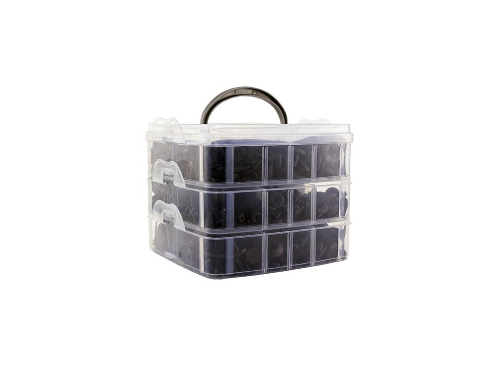Univerzálna sada upínacích patentov.Je vhodná na upevnenie vnútorných a vonkajších plastových prvkov a bubnových dosiek väčšiny automobilov.Patentky vyrobené z pevného plastu sú navrhnuté pre dlhú životnosť.Sada obsahuje celkom 620 patentov rôznych typov a veľkostí.Sada obsahuje aj 5 nástrojov, pomocou ktorých je možné efektívne vykonávať montážny pracovný proces.