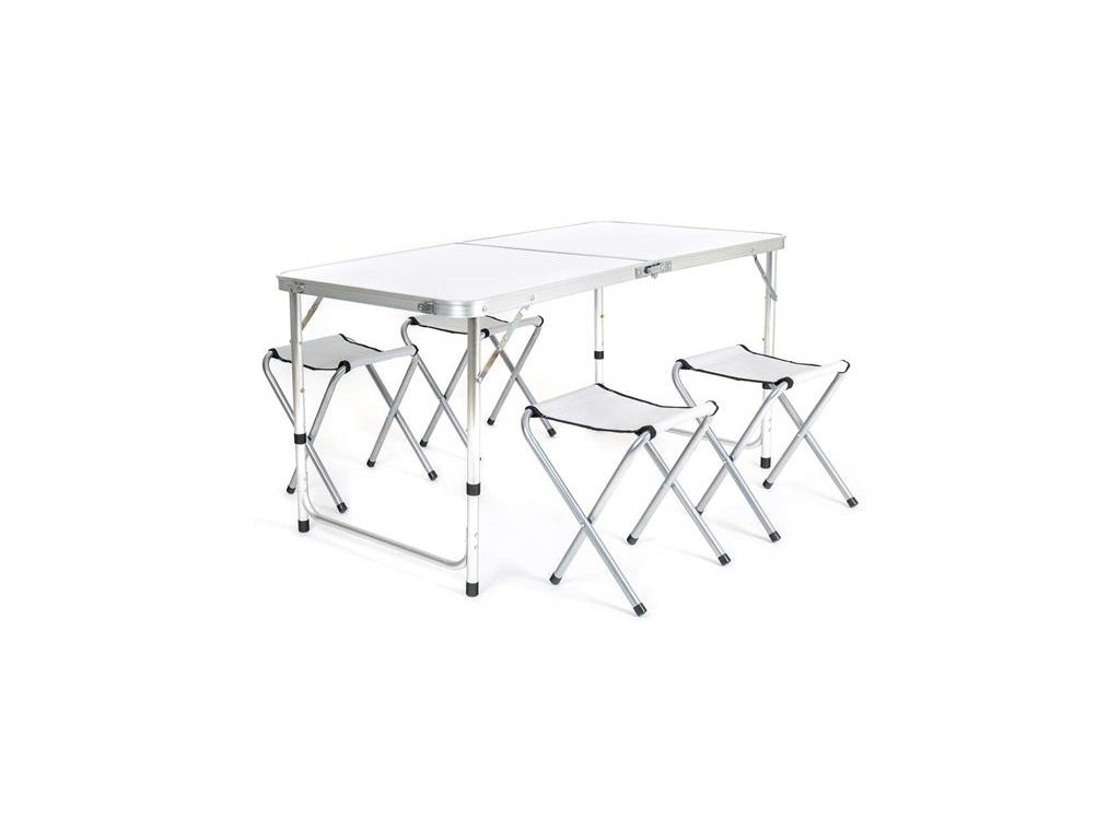 Kampingová sada BILBAO obsahuje stôl s konštrukciou z hliníka s rozmermi 120 x 60 cm s nastaviteľnou výškou 70/62/55 cm a 4 oceľové stoličky s rozmermi 33 x 31 x 35 cm. Sada je vhodná na kemping, cestovanie, outdoor, ale aj na záhradu. Jej nespornú výhodu je zloženie do kufríka s rozmermi 62 x 7,5 x 63 cm pre ľahké prenášanie. Nosnosť stoličiek je 100 kg.