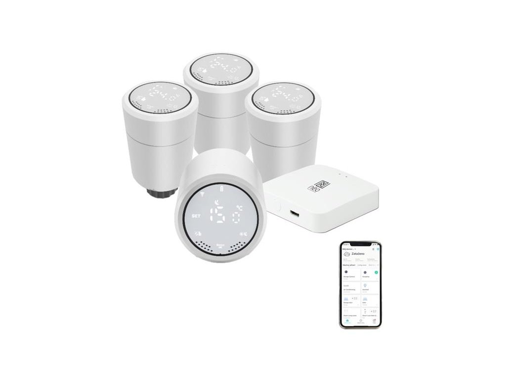 Termostatická hlavica múdra programovateľná (štyri kusy v balení) + centrálna jednotka Immax NEO BRIDGE PRE Smart Zigbee 3.0 v3, TUYA, Zigbee, fungovanie dotykovo alebo cez centrálnu jednotku, slúžiacu na ovládanie vykurovania v domácnosti, s umiestnením na radiátor, napájaná batériami 2xAA, týždenná a denné programovanie, 6 voliteľných režimov, kalibrácia teploty, detský zámok, kompatibilný s ventilmi typu RA, RAV a RAVL, aplikácia Immax NEO PRO v slovenčine a ďalších 60 jazykoch kompatibilná s iOS, Android, s hlasovými asistentmi Amazon Alexa, Apple Siri skratky, Google Assistant a ďalej so systémami TUYA, SmartThings, LIDL.