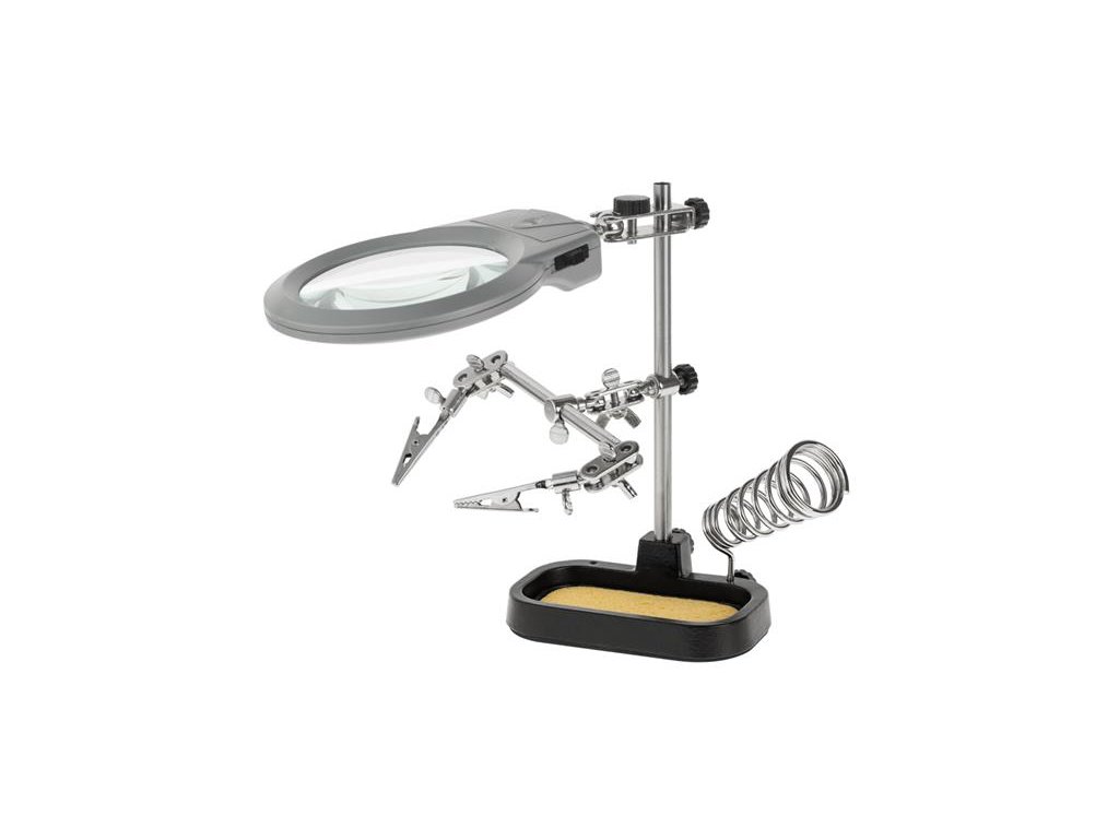 Sada nástrojov „z tretej ruky“ je praktický a všestranný nástroj, ktorý podporuje presné spájkovanie a prácu s malými súčiastkami. Táto sada s nastaviteľnými ramenami so svorkami, lupou a LED osvetlením je ideálna ako pre amatérov, tak pre profesionálov v oblasti elektroniky.