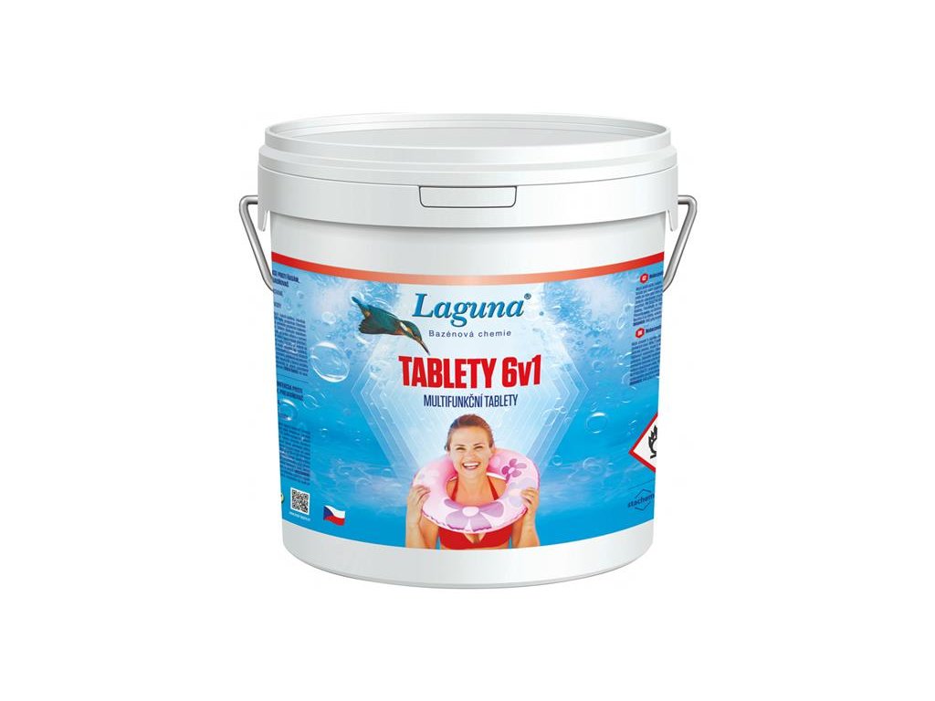 Moderný viacúčelový prípravok (tableta 200 g) na celosezónnu priebežnú údržbu vody vo všetkých typoch bazénov. LAGUNA TABLETY 6 v 1 je moderný viacúčelový prípravok na celosezónnu priebežnú údržbu vody vo všetkých typoch bazénov. Likviduje baktérie a riasy, zabraňuje ich rastu, umožňuje vyvločkovanie nečistôt, stabilizuje aktívny chlór, tvrdosť vody, prejasňuje (zlepšuje efektivitu filtrácie).