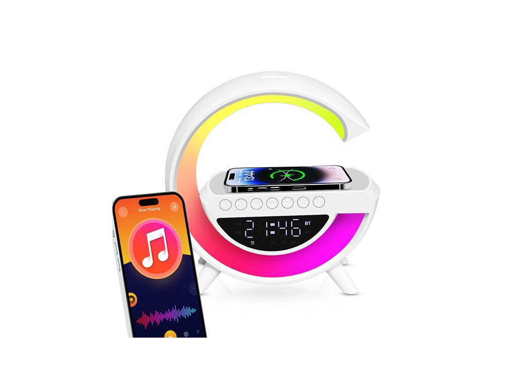 Perfektný do spálne, kancelárie alebo obývacej izby, kombinuje funkcie LED lampy, bezdrôtové nabíjačky, Bluetooth reproduktora, FM rádia a budíka.