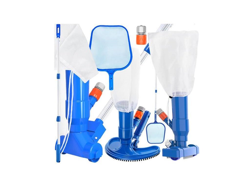 Súprava obsahuje bazénový vysávač s filtrom, ideálny pre domáce bazény, a univerzálny podberák na zber nečistôt z hladiny vody.