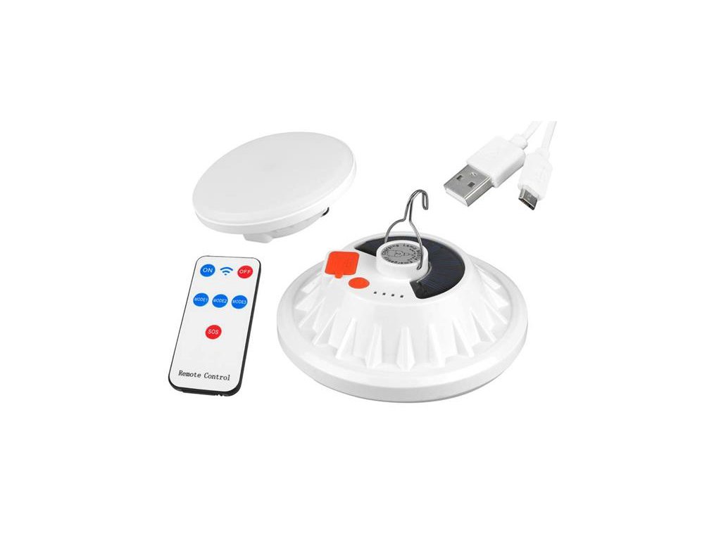 Funkčná kempingová lampa napájaná vstavanou batériou a solárnym panelom. Možnosť zavesenia do stanu (vstavané madlo). Je to silný zdroj svetla vďaka použitiu LED diód. Lampa je odolná proti prachu, nárazom a postriekaniu (IP65), bude úspešne fungovať vo vonkajších podmienkach. Má niekoľko režimov svietenia a nastaviteľný výkon svietenia. Vstavaný USB port umožňuje nabíjať ďalšie zariadenia (napr.)