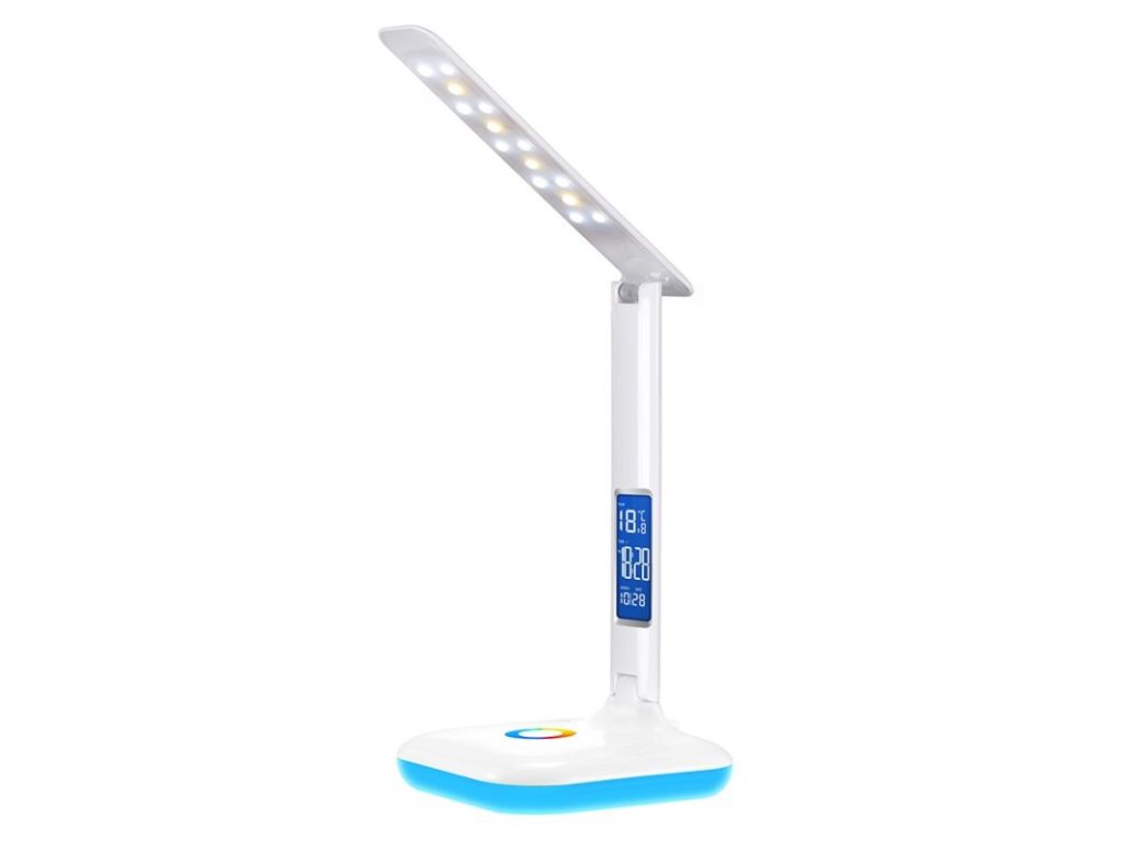 Elegantná stolná LED lampa s 3 svetelnými režimami, žiariaci RGB kruh na stojane slúži na dotykové ovládanie, na displeji sa zobrazuje dátum, čas a aktuálna teplota. Uhol dopadu svetla: 120°, životnosť: 30 000h, teplota farby svetla: 2800-5500K, druh a počet diód: 10 + 4 LED 2835 SMD, indikátor CRI: nad 80, počet cyklov zapnutie/vypnutie: 50 000, štartovací čas: menej ako 0,5s, trieda krytia IP: IP20, dĺžka kábla: 1,5mDodatočné parametre