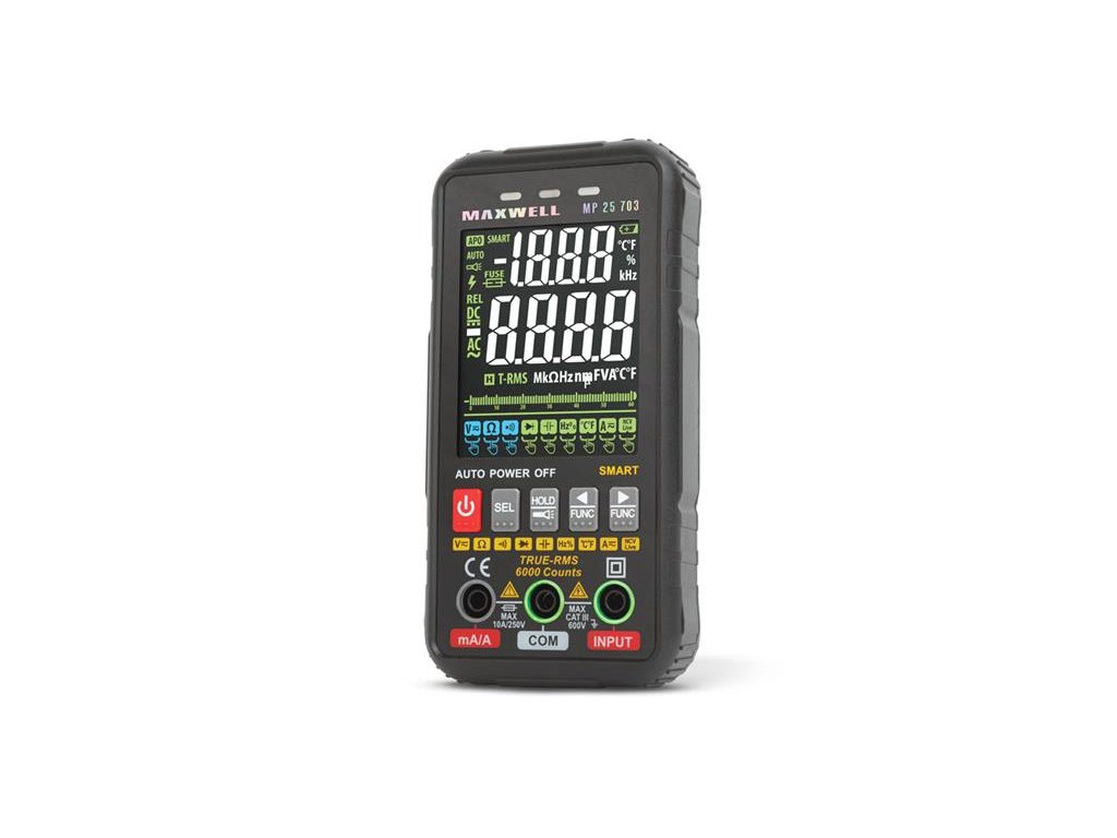 Prístroj vybavený veľkým farebným displejom, z ktorého sú namerané hodnoty ľahko čitateľné aj na slnku.Výhodou plnoautomatického multimetra je, že počas merania prístroj automaticky rozpozná, ktorá funkcia je potrebná a v danej funkcii vykoná meranie.Máte možnosť vybrať požadovanú funkciu aj manuálne, v tomto prípade LED svetlo okolo konektora pomáha správne pripojiť testovacie káble. Pomocou senzora na zadnej strane zariadenia môžete detektovať napätie bez toho aby ste prerušili vodiče. So zabudovanou pracovnou lampou môžete osvietiť pracovnú plochu. Zariadenie charakterizuje ergonomické vyhotovenie, kompaktný rozmer a jednoduché ovládanie.Praktická taška s pevnou stenou ochráni vaše zariadenie počas prepravy.