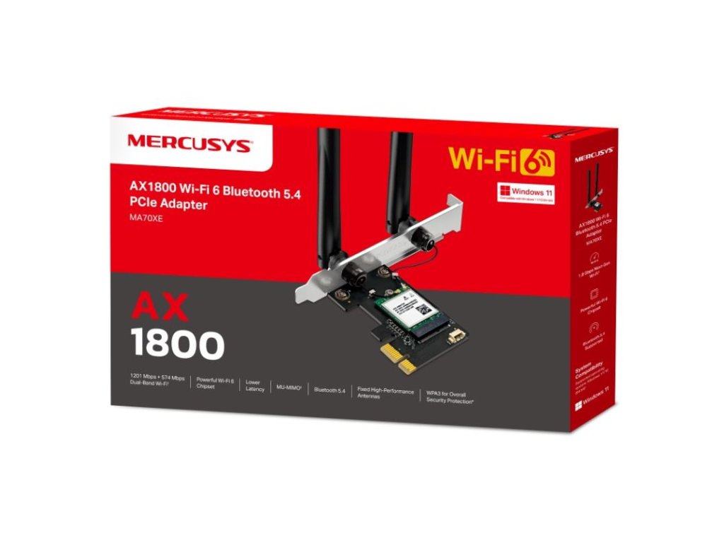MERCUSYS MA70XE, PCIe karta AX1800 Wi-Fi/BT adaptér - AX1800 Wi-Fi 6 PCIe adaptér s Bluetooth 5.4 pre stolné počítače. Poskytuje duálne pásmo s rýchlosťou 1201 Mbps (5 GHz) + 574 Mbps (2,4 GHz). Vybavený Intel AX211 chipsetom, 2 odnímatelnými anténami a podporou MU-MIMO, OFDMA a Beamforming technológií. Kompatibilný s Windows 11/10 (64-bit), ponúka WPA3 zabezpečenie a jednoduchú inštaláciu typu Plug & Play.Dodatočné parametre