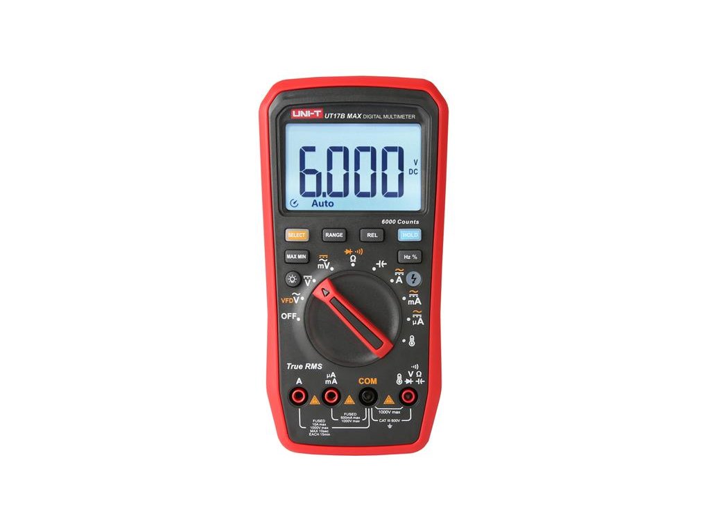 Na tento výrobok poskytujeme 3 roky záruku. Digitálne multimetre UT17B MAX je spoľahlivý digitálny multimeter typu True-RMS. Multimeter je navrhnutý tak, aby odolával rušeniu a dokáže odfiltrovať rušenie od nosnej frekvencie prekrytej sínusovým signálom alebo signálom rôzneho skreslenia napätia a je schopný merať výstupné napätie pohonu s premenlivou frekvenciou. V režime jednosmerného/ striedavého napätia môže prístroj vykonávať meranie frekvencie a pracovného cyklu. UT17B MAX má funkciu merania teploty s rozlíšením 0,1 C.
