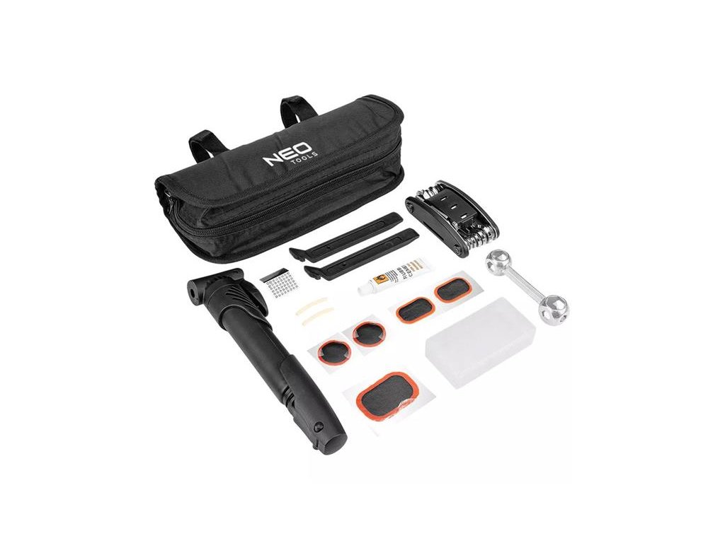 Sada ďalej obsahuje: mini pumpu, páky na pneumatiky, kovový šesťhranný kľúč, cyklistické multifunkčné náradie, záplaty na duše, silikónové hadičky, lepidlo a odstraňovač oteru. Tento komplexný produkt značky NEO bude fungovať v mnohých situáciách.