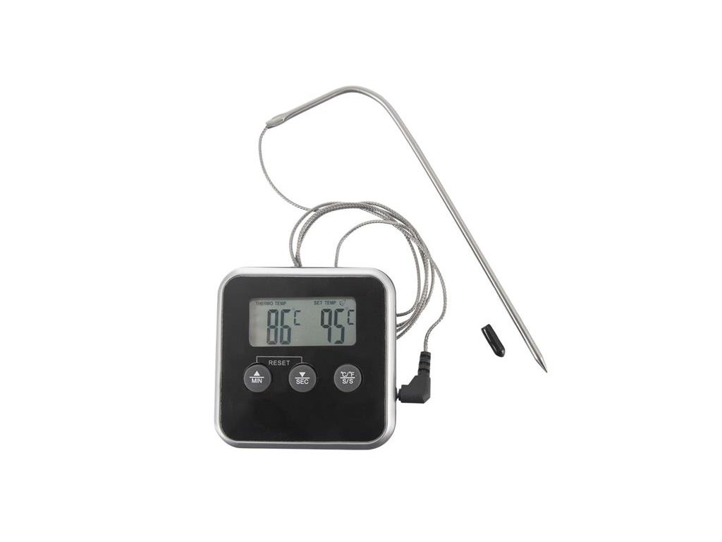 Kuchynský digitálny teplomer so sondou a kuchynská minútka v jednom je skvelý pomocník nielen pri príprave mäsa. Využiť ho môžete pri grilovaní na grile, pečení mäsa v rúre, pri údení v udiarni, pri chladení potravín v chladničke, pri varení džemov, sirupov, karamelu... Teplomer umožňuje nastaviť teplotný alarm pri dosiahnutí požadovanej teploty. Akonáhle teplota pokrmu dosiahne zvolenú teplotu, ozve sa zvukový signál. Alebo môžete zvoliť režim minútky, ktoré klasicky odpočíta nastavený čas ao jeho konci vás informuje zvukový signál. Možnosť nastavenia jednotky teploty: °C/°F. Rozsah merania teploty: od -20 °C do +300 °C, rozsah časovača 99 min 59 sec. Možnosť zavesenia, postavenia pomocou stojanu alebo prichytenie magnetom na zadnej strane teplomeru. Prepínač časovača a meranie teploty na zadnej strane teplomera (COOK/TIMER).