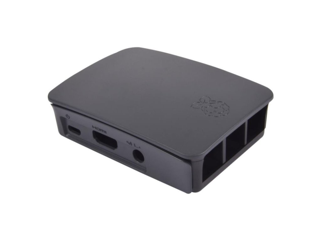 Čierno-šedá skrinka pre Raspberry Pi 3 Model B a B+ s vyrezanými otvormi na porty.