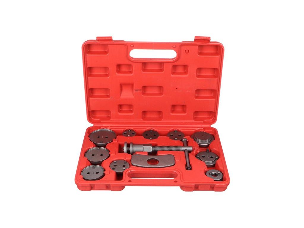 Univerzálna sada stlačovákov brzdových piestov BRAKE SET s 12 dielmi v plastovom kufri vhodná na montáž/spätné vrátenie piestov/strmeňov kotúčových bŕzd. Sada obsahuje stláčaciu pravotočivú závitnicu s magnetom, doraz a 10 rôznych adaptérov. Pri vozidlách so strmeňmi kotúčových bŕzd as integrovanou jednotkou ručnej brzdy sa spätné vrátenie brzdových piestov vykonáva spätným otáčaním, pri ostatných vozidlách spätným stlačením týchto piestov.