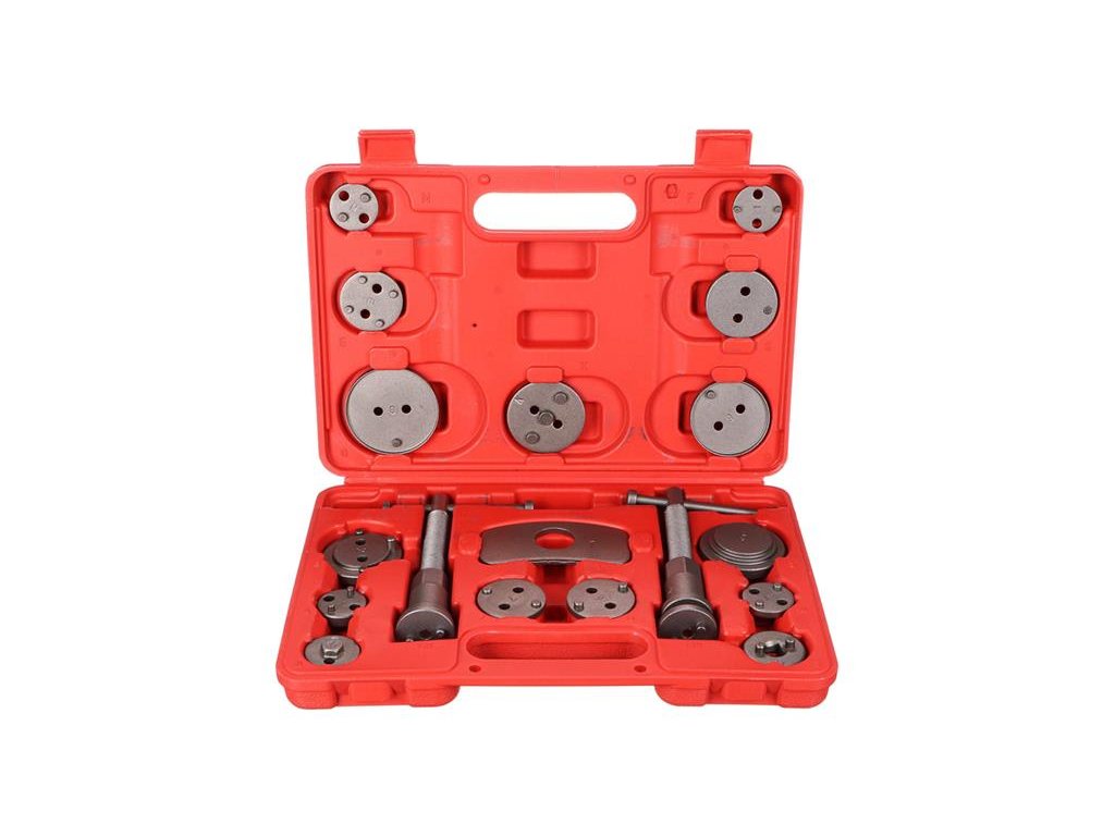 Univerzálna sada stlačovákov brzdových piestov BRAKE SET s 18 dielmi v plastovom kufri vhodná na montáž/spätné vrátenie piestov/strmeňov kotúčových bŕzd. Sada obsahuje pravotočivú aj ľavotočivú stláčaciu závitnicu s magnetom, doraz a 15 rôznych adaptérov. Pri vozidlách so strmeňmi kotúčových bŕzd as integrovanou jednotkou ručnej brzdy sa spätné vrátenie brzdových piestov vykonáva spätným otáčaním, pri ostatných vozidlách spätným stlačením týchto piestov.