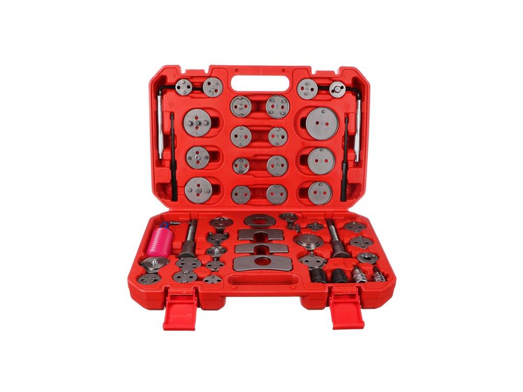 Ultimátna sada stláčačov brzdových piestov BRAKE SET s 50 dielmi v plastovom kufri vhodná na montáž/spätné vrátenie piestov/strmeňov kotúčových bŕzd. Sada obsahuje pravotočivú aj ľavotočivú stláčaciu závitnicu s magnetom, štyri dorazy, dva imbusové kľúče, úderníky, nádobku na mazivo a množstvo rôznych adaptérov. Pri vozidlách so strmeňmi kotúčových bŕzd as integrovanou jednotkou ručnej brzdy sa spätné vrátenie brzdových piestov vykonáva spätným otáčaním, pri ostatných vozidlách spätným stlačením týchto piestov.
