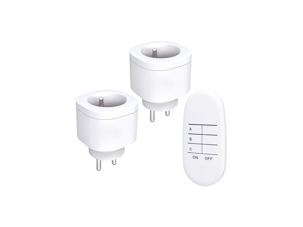 Dálkově ovládané zásuvky set 2 + 1, 2 zásuvky, 1 ovladač, learning code 2 x zásuvka a 1 x dálkový ovladač Automatické nastavení přenosové frekvence (learning code), až 3 zásuvky na ovladač Funkce „Learning code“ umožňuje spárování většího množství zásuvek a dálkového ovladače do jedné sady Možnost ručního zapnutí a vypnutí Dětské pojistky LED indikace Dosah signálu na otevřeném prostranství: 30 m Technické údaje: Napájení: dálkový ovladač: 1 x CR2032 baterie (součást balení) zásuvky: AC 230V, 50Hz Max.: 3000 W, AC 230V/13A Přenosová frekvence: 433,92 MHz Pracovní teplota: 0°C až +35°C Barva: bílá