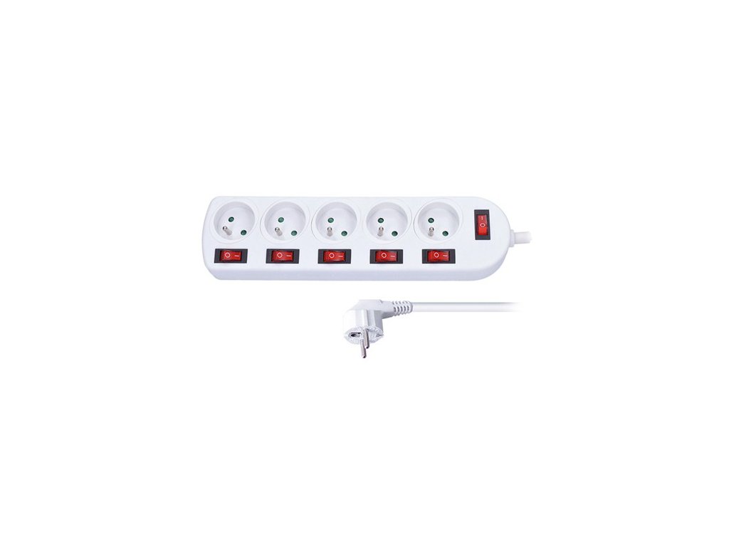 Prodlužovací přívod, 5 zásuvek, bílý, 6x vypínač, 2m PP143 Počet zásuvek: 5 Individuální vypínač pro každou zásuvku Centrální vypínač všech zásuvek Průřez vodičů: 3 x 1mm² Typ kabelu: H05VV-F3 Lomená vidlice Barva: bílá Délka: 2 m 230V/10A