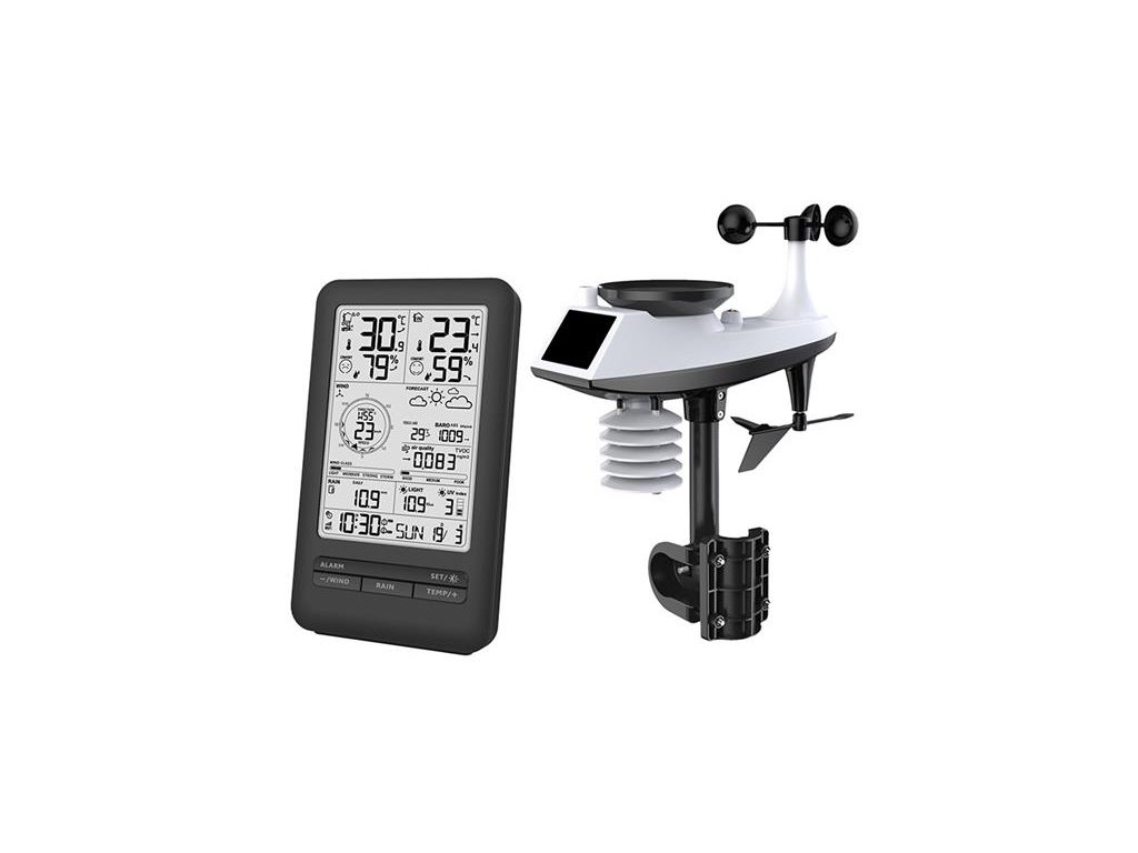 Solight profesionálny smart WIFI meteostanice Technické parametre: kalendár do roku 2099 čas automaticky nastaviteľný pomocou internetovej služby dni v týždni v jazykoch: čeština, slovenčina, angličtina, nemčina, francúzština, španielčina, taliančina, holandčina, dánčina, portugalčina, nórčina, švédčina, poľština, fínčina a maďarčina dva budíky funkcia automatického odloženia budíky (OFF alebo 5 - 60min) kvalita ovzdušia snímač obsahu škodlivých látok v ovzduší TVOC 0-9,999mg/m3 8 úrovní koncentrácie teplota: vnútorná teplota: -20 °C až 50 °C vonkajšia teplota: -40 °C až 70 °C vlhkosť: vnútorná a vonkajšia vlhkosť: 20 % až 95 % 5 úrovní vnútorného a vonkajšieho pocitového komfortu tlak vzduchu: rozsah merania atmosférického tlaku: 600 až 1100 hPa zrážky rozsah na meranie zrážok: 0 až 9999 mm vietor rozsah na meranie rýchlosti vetra: 0 až 180 km/h rozsah na meranie smeru vetra: 0 až 359 stupňov zobrazenie 12 úrovní Beaufortovej stupnice svetelný a UV index rozsah merania intenzity svetla: 0 až 128 klux (0 až 1378 kfc) rozsah zobrazenia indexu UV: 0 až 15 indikácia úrovne slnečnej expozície vonkajší senzor: vysielacia frekvencia 433,92 MHz RF dosah až 100 metrov v otvorenom priestore, bez stien a podláh aplikácia Smart Life / Tuya Smart zobrazenie aktuálne meraných hodnôt v aplikácii prevod nameraných meteorologických dát do prehľadných grafov v aplikácii 4 úrovne podsvietenia displeja napájanie: meteorologická stanica: DC 5V / 1A batéria: 2 x LR6 AA 1,5V kombinovaný bezdrôtový diaľkový senzor: batéria: 3 x LR6 AA 1,5V bezdrôtové senzor vlhkosti a teploty (možno pripojiť až 3ks) batéria: 2 x LR6 AA 1,5V rozmery stanice: 145*48*85 mm rozmery meracej konzoly: 350*47*135mm
